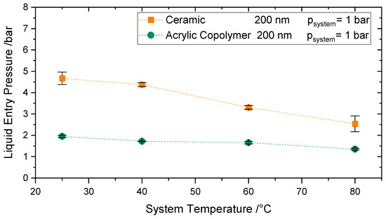 The effect of temperatures up to 80 °C at atmospheric pressure on the LEP was investigated for the Versapor® 200-R and the ceramic membrane IKTS-200, both with a reported pore size of 200 nm. Figure 10 reveals a decrease of 30% (for the Versapor Membranes) and of 45% (for the ceramic membranes) of LEP for temperatures up to 80 °C. At ambient pressure, a decrease of 13% [48] in surface tension is expected when the temperature is increased up to 80 °C, see. The remaining LEP decrease at this temperature range (15–30%) may be due to the change of contact angle with temperature and further secondary effects.