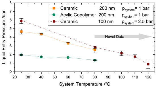 To the best of the authors’ knowledge, there exist no comparable values of LEP directly measured at constant temperature conditions in the literature at this higher temperature range and increased pressure. Varela-Corredor [17] characterized the LEP of titania-based tubular membranes up to 105 °C. He measured a liquid entry temperature of nearly 130 °C by establishing a very low constant transmembrane pressure.