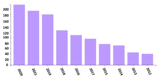 Over the last few decades, a wide range of wound barrier materials have been studied, such as films, hydrogel, emulsions, composites, nano/microfibers, and so on [,,,,,,]. Among them, nano/microfibers, in particular, have shown a promising future in wound dressing applications in recent years, making them very appealing to researchers. Figure 1 shows the growing number of publications in electrospinning for wound healing applications from the Web of Science database.