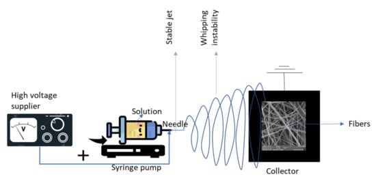 Electrospinning is a voltage-driven technique in which a liquid droplet is electrified to create a jet, which is then stretched and elongated to create fibers. The main setup for electrospinning, shown in Figure 2, includes a spinneret (syringe needle) connected to a high-voltage (5 to 50 kV) supplier, a syringe pump, and a grounded or oppositely charged collector.