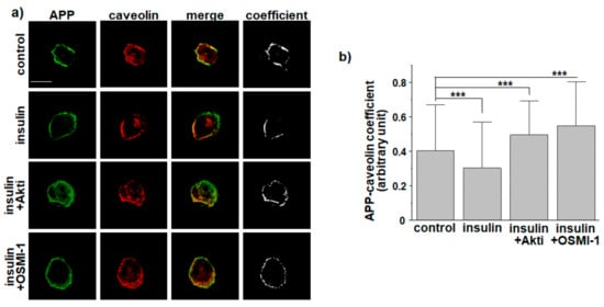 Effects of insulin on APP O-GlcNAcylation and APP endocytosis are mediated by Akt signaling and OGT [29]. Thus, we tested the effect of insulin on APP localization in lipid rafts in the presence of Akt inhibitor (Akti) or OGT inhibitor (OSMI-1). Inhibitory effects of insulin on colocalization of APP and caveolin were completely blocked in the presence of Akti or OSMI-1, indicating that the insulin effect was mediated by Akt and OGT signaling (Figure 1a,b). It was noteworthy that levels of colocalization were higher in the presence of these inhibitors than in control cells, indicating basal activities of Akt or OGT in control conditions as we observed previously [29].