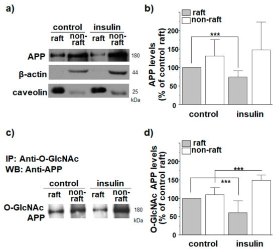 We measured levels of O-GlcNAcylated APP in raft and non-raft fractions using the immunoprecipitation method. First, O-GlcNAcylated proteins were pulled down from raft and non-raft fractions using an antibody against O-GlcNAc. APP antibody was then used to detect O-GlcNAcylated APP. A typical result is shown in Figure 2c. Relative O-GlcNAcylated APP levels in each fraction were calculated as shown in Figure 2d (n = 7, number of independent experiments). In control cells, O-GlcNAcylated APP showed similar distributions between raft and non-raft fractions. Insulin significantly decreased O-GlcNAcylated APP level in raft fractions by 39%. Conversely, the O-GlcNAcylated APP level in non-raft fractions was increased from 110% to 149% in response to insulin. To confirm this result, we first pulled down APP from raft and non-raft fractions using APP antibody and then detected O-GlcNAcylated APP using O-GlcNAc antibody. Insulin decreased O-GlcNAcylated APP level in lipid raft fractions, which was consistent with results in Figure 2c,d (Figure S6). Insulin increased O-GlcNAcylated APP level in non-rafts, although it was not statistically significant. Thus, these results may suggest that O-GlcNAcylation translocates APP from lipid rafts into non-raft microdomains.