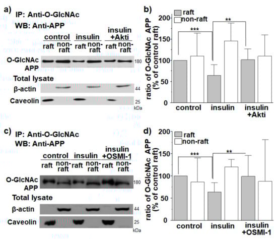 Then, we tested whether the effect of insulin on translocation of O-GlcNAcylated APP into non-raft fractions occurred via Akt signaling and OGT. In the presence of Akt inhibitor, the effect of insulin on localization of O-GlcNAcylated APP in lipid rafts was completely prevented (Figure 3a,b; n = 7, number of independent experiments). A similar result was obtained with an OGT inhibitor (Figure 3c,d; n = 7, number of independent experiments). These results suggest that the effect of insulin on translocation of O-GlcNAcylated APP into non-rafts occurred via Akt signaling and OGT. The level of caveolin was not changed either by Akt inhibitor or OGT inhibitor (Figure S5).