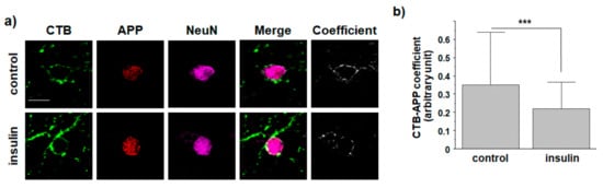 We next tested whether insulin affected the localization of APP in lipid rafts from primary hippocampal neurons from Sprague-Dawley rats. To monitor the localization of APP at the plasma membrane, cells were co-stained with APP antibody and CTB. Neurons were incubated with 1 μM insulin for 2 h. After cells were fixed and permeabilized, they were incubated with NeuN for 2 h to identify neurons. Typical immunoreactivities of APP and CTB are shown in Figure 5a. Intensities were quantified and shown in Figure 5b (n = 30, number of cells from four independent experiments). The coefficient of APP and CTB was significantly decreased by 39.6% in insulin-treated neurons compared to that in control neurons. This result suggested that insulin could promote the translocation of endogenous APP from lipid raft to non-raft microdomains in neurons. Since we have already confirmed the reduction in Aβ42 secretion by insulin from cultured cortical neurons in a previous study [29], our results suggest that insulin might affect APP endocytosis and Aβ production in neurons.