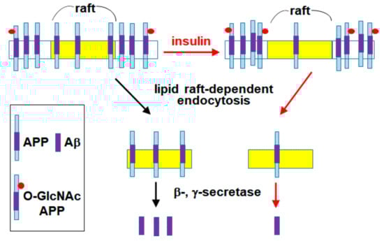 We have previously reported that APP O-GlcNAcylation in response to insulin signaling can promote the non-amyloidogenic pathway by decreasing APP endocytosis [29]. The present study showed that O-GlcNAcylated APP in response to insulin decreased APP localization in lipid rafts and consequently decreased lipid raft-dependent APP endocytosis. A schematic model summarizing our results is shown in Figure 6. We have recently shown that a significant amount of APP is localized in lipid rafts, and that up-regulation of cellular cholesterol levels can increase APP localization in lipid rafts [58]. Also, we reported that cholesterol levels affect the rate of lipid raft-dependent APP internalization [59]. It is well known that APP metabolism is affected by APP trafficking and APP localization in intracellular compartments [10,11,12]. Thus, endocytosis of APP is a crucial step in Aβ generation. APP is synthesized in the ER and transported to TGN and the plasma membrane where it is predominantly cleaved by α-secretase [6]. Alternatively, APP in the plasma membrane is internalized via endocytosis. APP is then sorted into endosomes or lysosomes where it is likely to be cleaved by β-secretase [7,8,9].