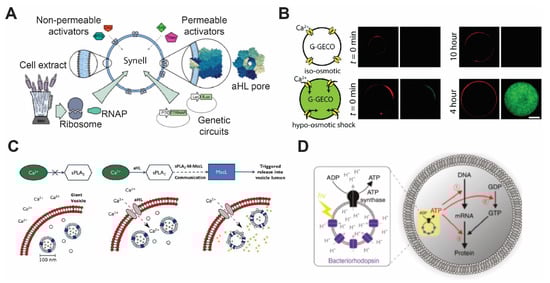 - Garamella, J.; Majumder, S.; Liu, A.P.; Noireaux, V. An Adaptive Synthetic Cell Based on Mechanosensing, Biosensing, and Inducible Gene Circuits. ACS Synth. Biol. 2019, 8, 1913–1920. [Google Scholar] [CrossRef] [PubMed]