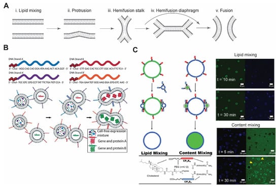 DNA-based interaction provides an excellent strategy for membrane fusion due to the high selectivity between DNA strands. In this approach, cholesterol- or lipid-anchored DNA spontaneously becomes part of the membrane, with DNA strands exposed on the outer surface of vesicles [,]. By bringing apposing vesicles into close proximity, fusion of the bilayer membrane occurs due to hybridization of DNA strands. Membrane fusion can be confirmed by lipid mixing and content mixing. Later, Hook and co-workers investigated the effect of DNA length, number of DNA strands, and number of cholesterol groups on membrane fusion []. When comparing the efficacy of fusion between single-stranded DNA and double-stranded DNA with overhang (complementary overhang on the other vesicle), double-stranded DNA showed improved binding affinity compared to single-stranded DNA, where there was some degree of dissociation of hybridized strands [,]. In case of single-stranded DNA and a single cholesterol group, content leakage and dissociation of docked vesicles were observed []. They also found that longer DNA strands increased vesicle docking but failed to lead to vesicle fusion. Recently, Peruzzi et al. showed the initiation of CFE by DNA-mediated vesicle fusion and found that phase-segregation of membrane domains enhances fusion between different vesicle populations (Figure 3B) []. Controlling fusion by using DNA-tethered vesicles provides exquisite specificity and expands the opportunities to control spatiotemporal dynamics of CFE reactions.