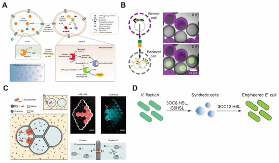 Synthetic cell communication with synthetic or living cells. (A) Signal amplification via allosteric activation of glycogen phosphorylase b by AMP. Sender cells generate AMP and send it through α-HL pores. Reproduced from Reference [] with permission from Springer Nature, copyright 2020. (B) Porous synthetic cells that contain DNA-bound clay synthesize signal molecules and send them via chemical diffusion. Receiver cells encapsulate DNA sequences that encode binding sites for the signal molecules. Reproduced from Reference [] with permission from Springer Nature, copyright 2018. (C) Reconstitution of synthetic cell communication in a network of droplet interface bilayers. The signal propagates through α-HL (left) or diffuses across the membranes (right) and activates cell-free expression of reporter proteins. Reproduced from Reference [] with permission from Springer Nature, copyright 2019. (D) Synthetic cell–living cell communication via homoserine lactone molecules. Synthetic cells sense the presence of V. fischeri and send signal molecules to E. coli, thereby making E. coli sensitive to V. fischeri quorum-sensing molecules. Redrawn from Reference [] with permission from American Chemical Society, copyright 2017.