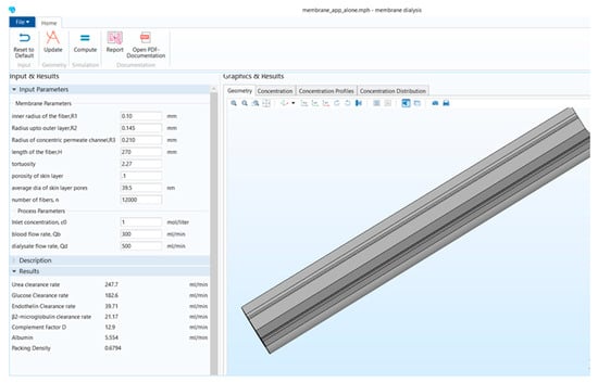 Due to the simulation models’ complexity, only researchers having expertise in computational analysis can use the solvers, i.e., MATLAB® R2020b, ANSYS Fluent® 2021R1, and COMSOL Multiphysics® V5. A stand-alone application that provides precise user interphase is developed in COMSOL Application builder [22]. COMSOL Inc. has developed an application that enables studying the effect of few membrane properties and design parameters on module clearance efficiency. However, the COMSOL application has no mathematical model for the transport of solutes across the membrane, and the solutes are not defined as well. The COMSOL application cannot be used without COMSOL Multiphysics software [23]. Nevertheless, it inspires the development of a stand-alone computational tool based on a detailed mathematical membrane model.