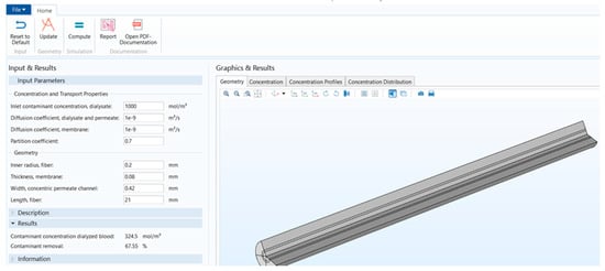 The comparison of results obtained from these two applications is given in Table 3. It can be seen from Table 3 that in the COMSOL application, the contaminants were not defined, and it was built by considering water on both blood and dialysate compartments. Therefore, the results obtained by the COMSOL application showed the water flux across the membrane. The dialyzer efficiency depends on the clearance rate of different solutes obtained from the dialyzer membrane [24]. Thus, the stand-alone computational tool included the clearance rate of six different solutes present in the blood. The packing density (PD) of the fibers enclosed in the dialyzer’s shell depends on the hollow fiber and annulus radius and the total number of fibers. The change in either radius (R1, R2, R3) or the number of fibers (N) not only affects the clearance rate of toxins but also impacts the packing density (PD) of the dialyzer [17]. Since PD helps to optimize the number of fibers and the dialyzer’s clearance efficiency, it is also included in the results of the stand-alone computational tool. Development of form is shown in Figures S2–S17. Table 4 presents the critical input parameters extracted from the literature for this study [10,15].