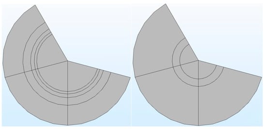 It can be seen from Table 1 that in the COMSOL application, the diffusion coefficient, D(m/s), of solutes and the membrane diffusion coefficient, Dm(m/s), were taken as constant values. The diffusion coefficient of solute, D(m/s), depends on the solute’s molecular weight. The membrane diffusion coefficient, Dm, depends on the membrane’s characteristics (i.e., tortuosity τ, membrane j-th layer porosity Ɛmj, friction coefficient F(p), steric hindrance factor HD). Therefore, in the stand-alone application, these two parameters were mathematically modeled. The COMSOL application is built with a mathematical model, in which the average velocity on the dialysate and permeate side of the dialyzer was taken as a pre-defined numeric value. The average velocity of blood and dialysate is a function of the blood and dialysate flow rate. The blood and dialysate side velocity has been modeled with the continuity equation and the Naiver–Stokes equation in a stand-alone application. The user can change the blood and dialysate flow rate. Details of these mathematical equations are presented in a published study [24]. The experimental studies have shown that the synthetic membrane used in dialyzers are multi-layer membranes [15]. Figure 3 shows the cross-sectional view of the hollow fiber membrane in the stand-alone application and COMSOL application. That stand-alone application simulates a multi-layered (i.e., skin, middle, bulk) membrane, as evident from the cross-sectional view of the two membranes. In contrast, the COMSOL application simulates a single-layer membrane.