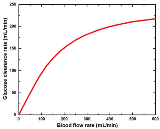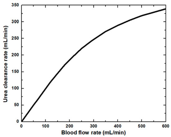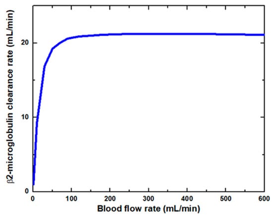 Figure 6 shows that the glucose clearance rate also rises with the blood flow rate and steadily achieves the highest value. The glucose clearance rate increases fastest from a blood flow rate of 0–300 mL/min and reaches the value of 175 mL/min. The effect of blood flow rate on the glucose clearance rate decreases as the blood flow rate increases, i.e., 300–600 mL/min. Figure 7 shows that the endothelin clearance rate increases sharply and reaches 38 mL/min at low blood flow rate values, i.e., 0–100 mL/min. At the highest value of blood flow rate, it can be observed that the endothelin clearance rate changes marginally. Figure 8 demonstrates the effect of blood flow rate on the clearance rate of β2-microglobulin. The β2-microglobulin clearance rate reaches the maximum value of 22 mL/min at 100 mL/min blood flow rate. The larger molecules, such as β2-microglobulin, cannot pass easily through the conventional dialysis membranes and are therefore conserved in the patient’s blood. A universal highlight of synthetic membranes is their comparatively large pore size, following by high ultrafiltration coefficients and high clearances of β2-microglobulin. These results show that the blood flow rate increases the clearance of low molecular weight solutes (urea, glucose) but does not affect the clearance of high molecular weight. The increase in clearance with the blood flow rate can be attributed to the rise of concentration difference across the membrane. The concentration gradient across the membrane drives the transport of solutes. The concentration gradient was increased by increasing the blood flow rate, which ultimately enhanced the solutes’ clearance rate.