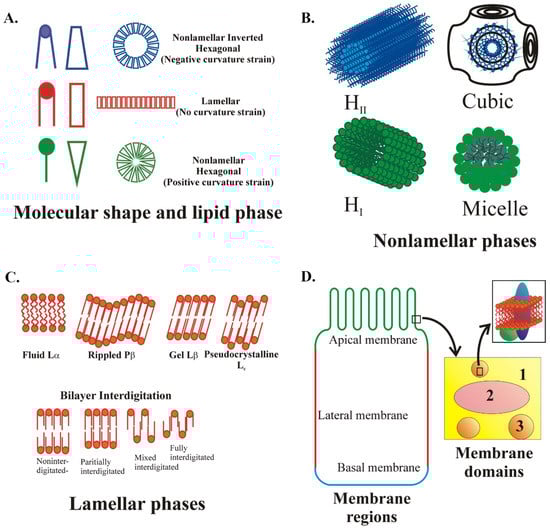 Lipid membrane phases. (A) Molecular shape and lipid phases, (B) different nonlamellar phases, (C) different lamellar phases, and (D) polarized cells such as small-intestine endothelial cells. Adapted from [3].