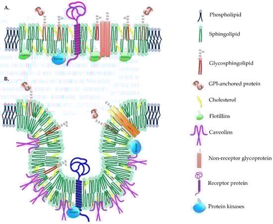 Specialized cell membrane domains. (A) non-caveolar lipid rafts and (B) caveolae. The different protein and lipid components are represented. Adapted from [39].