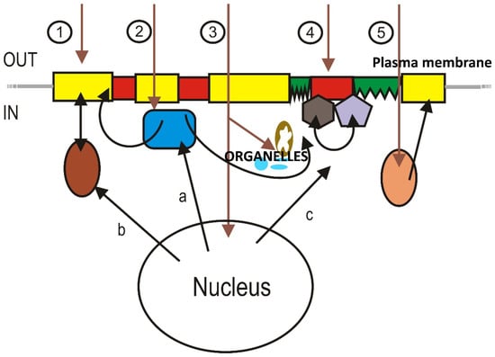 Changes in membrane lipids modify the biophysical properties of membranes, such as surface lipid packing, bilayer thickness, lipid lateral mobility, microdomain distribution (e.g., lipid rafts), surface and core membrane fluidity, surface charge, lamellar and nonlamellar phase propensity, etc. [2,55,56,57]. In this sense, the abundance and type of peripheral signaling proteins present at a given membrane are defined by the structural and physico-chemical properties of the membrane, such as its electric charge, membrane curvature, the presence of specific lipids, etc. Peripheral proteins, such as G proteins, PKC, Ras, Raf, etc., can be translocated to different PM microdomains or organelle membranes, as well as to soluble fractions. For example, the distribution of G proteins between membrane microdomains or aqueous compartments depends on the presence of certain lipids in membranes (Figure 3, case 4). Thus, nonlamellar prone domains favor interactions with dimeric (Gβγ) and trimeric (Gαβγ) forms of G proteins, whereas the monomeric form (Gα) prefers lamellar prone membrane microdomains [17,58]. Similarly, the membrane surface charge provided by phosphatidylserine (PS), phosphatidic acid (PA), or phosphatidylinositols (PIs) influences the binding of these proteins to membranes [58]. In this regard, an example of reversible modification with a palmitoyl moiety reduces the affinity of Gαi1 proteins to negatively charged and Ld membrane microdomains (Figure 3, case 5) [58]. Indeed, the restoration of the palmitoylation on cortical neuronal cells of patients with Huntington’s disease through the acyl-protein thioesterase 1 (APT1) inhibition by ML348 has been proposed as a mechanism to restore the axonal transport, synapse homeostasis, and survival signaling [59]. In short, if lipid alterations are associated with relevant diseases, melitherapy can be used to treat these conditions.
