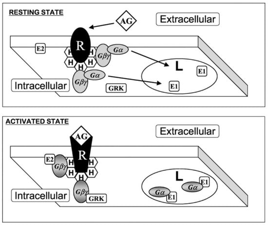 Lipid-Protein-Protein-Lipid (LPPL) interactions, membrane microdomains, and cell signaling. Upper panel, the Gαβγ protein is in the pre-active form in nonlamellar-prone membrane microdomains (HII), where it is pre-coupled to transmembrane receptors (R). Lower panel, agonist binding induces activation upon exchange of guanosine diphosphate (GDP) for guanosine triphosphate (GTP) in the alpha subunit. The dissociated Gαi1 protein moves to lipid raft domains where it interacts with signaling effector proteins (E1). In contrast, the Gβγ dimer remains in Ld (HII), where it interacts with G protein-coupled receptor kinase (GRK) or other signaling effector proteins (E2). Adapted from [17].