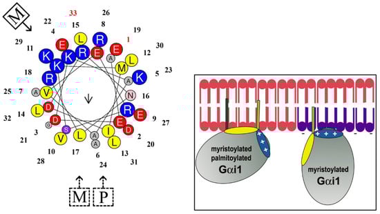 Effect of palmitoylation on Gαi1-membrane interactions. Gαi1 protein has N-terminal myristoyl (M) and palmitoyl (P) moieties. Whereas M is an irreversible lipidation, P can be enzymatically added or removed upon signaling control. Myristoylated-depalmitoylated G protein interacts with negatively charged membrane areas because the lipid anchor favors the exposure of positively charged amino acids to the membrane interface (M with arrow). Palmitoylation induces a twist in the N-terminal α-helix of Gαi1 protein that causes exposure of uncharged amino acids to the bilayer surface (P with arrow and M with arrow). This in part explains the ability of Gαi1 protein to have different lipid-protein-protein-lipid (LPPL) interactions, in which the configuration Lx-PG-Py-Ly (where G would be Gαi1) indicates that the transducer would interact with different lipids (Lx could be phosphatidylserine or another membrane lipid according to the palmitoylation status) and Py could be a G protein-coupled receptor (GPCR) or an effector protein (adenylyl cyclase). It has to be kept in mind that the Gβγ dimer also participates in these LPPL interactions [17]. Adapted from [58].