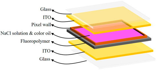 Pixels of EWDs are fabricated using microtechnology. A pixel of EWDs is mainly composed of transparent glass, indium tin oxide (ITO) electrodes, pixel walls, conductive liquid (NaCl solution), color oil, and a hydrophobic insulating layer (fluoropolymer) [30,31,32], as shown in Figure 1. The color oil sticks to the hydrophobic insulating layer and forms a thin film when no voltage is applied. At this point, the pixel is in an “off” state, and it displays the color of the oil. Instead, the surface wettability of the hydrophobic insulating layer can be changed when a certain voltage is applied to the two electrodes. Then, the color oil contracts to a corner of the pixel. Now, the pixel is in an “on” state, and it displays the color of a substrate. Therefore, different grayscales can be displayed by controlling driving voltages [33]. In addition, the contact angle value of the oil film follows the Lippmann–Young equation, as shown in Equation (1) [34].