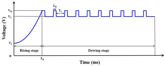 We proposed a new driving waveform to reduce the oil film splitting. The driving waveform includes a rising stage and a driving stage, as shown in Figure 3. The design of the rising stage is a quadratic function waveform with an initial voltage, which can be expressed by Equation (4).