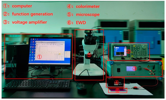 An experimental platform for testing the performance of the EWD. It was composed of a computer, a function generation, a voltage amplifier, a colorimeter, a microscope, and an EWD. The EWD was used as the tested object. The computer, the function generation, and the voltage amplifier were used to generate driving waveforms. Then, the colorimeter was used to obtain the luminance of the EWD, and the microscope was used to obtain the aperture ratio of the EWD.