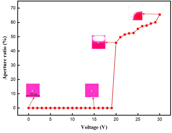 The aperture ratio of the EWD driven by DC voltages was tested to analyze the rupture threshold voltage of the oil film. The DC voltage was set to 0–30 V, and the experimental results are shown in Figure 5. When the DC voltage was 0–19 V, the aperture ratio remained unchanged, because the voltage had not reached the rupture threshold voltage of oil film at this time. Next, the aperture ratio began to rise when the driving voltage was 20 V, and then it was increased with the increase in the driving voltage. This phenomenon indicated that the oil film was ruptured when the driving voltage reached to 20 V, and that the oil film subsequently contracted to the corner of the pixel. Therefore, the rupture threshold voltage of the oil film was 20 V.