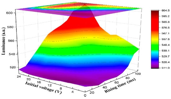 In the rising stage, the influence of the initial voltage and the rising time on the oil film splitting was analyzed. The initial voltage of the rising stage was set to 0–24 V, and the rising time of the rising stage was set to 10–100 ms. The luminance of different initial voltages and rising times are shown in Figure 6. It can be seen that the luminance was below 520 when the rising time was 10–20 ms. At this time, the intensity of the electric field applied to the EWD was increased rapidly due to the short rising time, which caused a serious oil film splitting. When the rising time was 30–100 ms, the luminance was first increased with the increase in the initial voltage, but it had a downward trend when the initial voltage exceeded 20 V. This phenomenon showed that the speed of oil film contraction could be increased with the increase in the applied electric field when the initial voltage was lower than the rupture threshold voltage. On the contrary, the increase in the initial voltage could lead to the increase in the oil film splitting degree when the initial voltage exceeded the rupture threshold voltage, which could decrease the luminance of the EWD. Therefore, the maximum luminance occurred when the initial voltage was 20 V. In addition, the luminance could be increased with the increase in rising time when the initial voltage was the same. It could be proven that the oil film can be effectively prevented from splitting by applying an electric field with a long rising time. However, the response speed of EWDs could be decreased when the rising time was long. Therefore, the rising time was set to 100 ms, which could effectively reduce the oil film splitting, and the response time of oil film cannot be excessively prolonged.