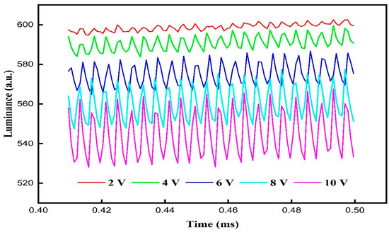 In the driving stage, the influence of voltage amplitudes on the oil film oscillation was analyzed. was set to 30 V, which was same as traditional driving waveforms. Voltage amplitudes of the driving stage were set to 2, 4, 6, 8, and 10 V. Luminance curves driven by different voltage amplitudes are shown in Figure 7. It can be seen that the amplitude of luminance oscillations could be increased with the increase in the voltage amplitude. The minimum amplitude of the luminance oscillation was 4.1 when the voltage amplitude was 2 V, and the maximum amplitude of luminance oscillation was 25.29 when the voltage amplitude was 10 V. The change of driving voltage could cause oil film oscillation in this process. In addition, the increase in voltage amplitude could increase the degree of oil film oscillation, which could lead to the increase in luminance oscillation. At the same time, the average luminance could be decreased with the increase in the voltage amplitude. The maximum average luminance was 598.79 when the voltage amplitude was 2 V, and the minimum average luminance was 544.63 when the voltage amplitude was 10 V. This phenomenon showed that the splitting of oil film was greater when the voltage amplitude was increased. Therefore, the voltage amplitude of the driving stage was set to 2 V to stabilize the oil film.