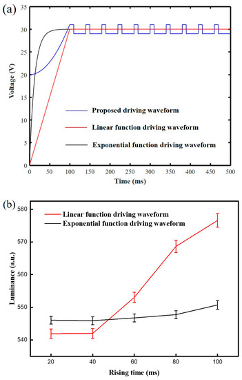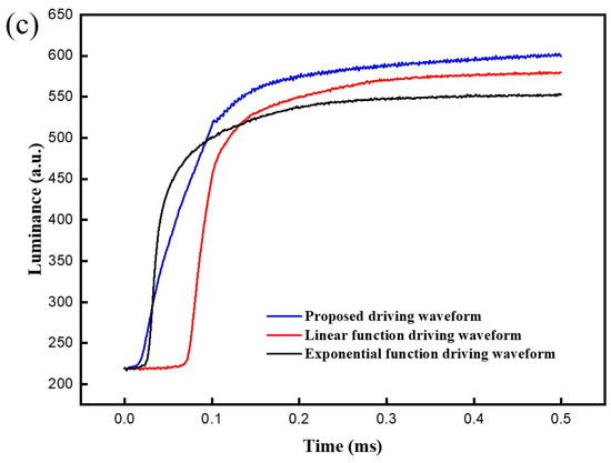 The exponential function driving waveform [19] and the linear function driving waveform [17] compared with the proposed driving waveform, as shown in Figure 8a. The luminance driven by different rising times of the exponential function driving waveform and the linear function driving waveform is shown in Figure 8b. It can be seen that the luminance curves of the exponential function driving waveform and the linear function driving waveform were positively correlated with the rising time, which had the same trend as the proposed driving waveform. The luminance can reach the maximum value at 100 ms. Therefore, rising times of the exponential function driving waveform and the linear function driving waveform were set to 100 ms, which was the same as the proposed driving waveform. Then, voltage amplitudes of the exponential function driving waveform and the linear function driving waveform were both set to 30 V. The initial voltage of the rising stage in the proposed driving waveform was set to 20 V; the high-level voltage and the low-level voltage in the driving stage were set to 31 V and 29 V, respectively. Luminance curves of different driving waveforms are shown in Figure 8c. It can be seen that the luminance of the proposed driving waveform increased the quickest at first, because its oil film ruptured speed was faster than that of other driving waveforms. Then, the oil film driven by the exponential function driving waveform was ruptured and its luminance was increased. The voltage rising rate of the exponential function driving waveform was higher than that of the proposed driving waveform, so the luminance increasing rate of the exponential function driving waveform can quickly exceed that of the proposed driving waveform. On the contrary, the rupture of oil film driven by the linear function driving waveform was the slowest, because it needed a long time to reach the rupture threshold voltage of oil film. When the luminance reached 500, the response time of the proposed driving waveform was 94.64 ms, while the exponential function driving waveform and the linear function driving waveform were 97.37 ms and 120.12 ms, respectively. When the luminance exceeded 500, the luminance of the exponential function driving waveform was increased slowly. On the contrary, the luminance of the proposed driving waveform and the linear function driving waveform exceeded that of the exponential function driving waveform. The luminance of the proposed driving waveform was higher than that of the linear function driving waveform. This phenomenon showed that the proposed driving waveform could effectively reduce the oil film splitting, while the exponential function driving waveform and the linear function driving waveform were affected by the oil film splitting, limiting the increase in luminance. Finally, the maximum luminance of the proposed driving waveform was 602.44, while the maximum luminance of the exponential function driving waveform and the linear function driving waveform were 579.97 and 553.81, respectively.