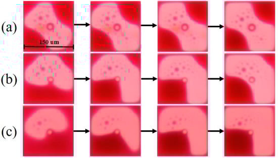 Oil film splitting describes a phenomenon in which the oil film splits into several pieces and cannot be reorganized during the contraction process [20]. The contraction process can be divided into an oil film rupture process and an oil film wetting process. The oil film rupture process refers to when the oil film is ruptured when the driving voltage reaches the rupture threshold voltage of oil film. The wetting process is when the oil film contracts to corners of the pixel, and its contact angle reaches to the Lippmann equilibrium contact angle [35]. The rupture threshold voltage, , of oil film can be obtained by Equation (2) [36].