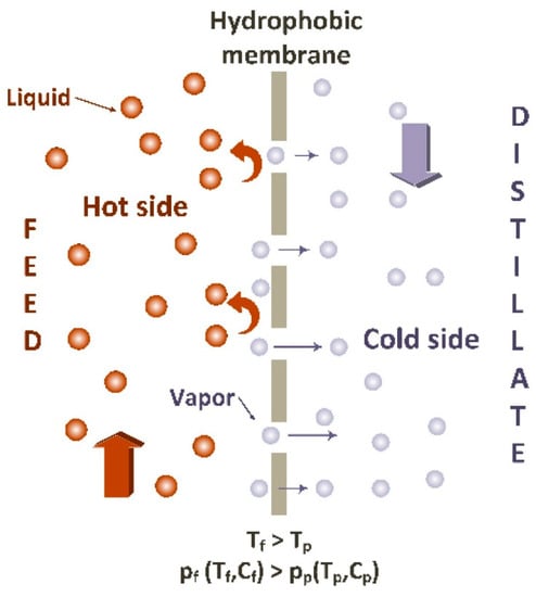 In recent years, the membrane distillation (MD) technique has gained substantial attention for desalination and wastewater treatment [,]. MD is a thermally driven process that uses the microporous hydrophobic membrane to separate the vapor phase from the liquid phase. In MD, the non-volatile components of the aqueous feed solution are retained in the feed solution by hydrophobic surface while the volatile parts (water vapor) are transported through the porous structure and collected as a distillate in a pure form (Figure 1). The driving force for the vapor transfer is the vapor pressure difference (ΔP) induced by temperature difference (ΔT) across the membrane []. This enables the separation of non-volatile solutes from water at lower operating temperatures and makes it possible to use low-grade waste heat and/or sustainable solar energy as heat sources that are widely available. Unlike RO, MD operates at atmospheric pressure but exhibits high ions and non-volatile rejections up to 99.9% from the solution, even close to saturated concentration [,]. Owing to the number of such advantages, MD appears to be cost-effective and energy-efficient with wide applications in desalination.