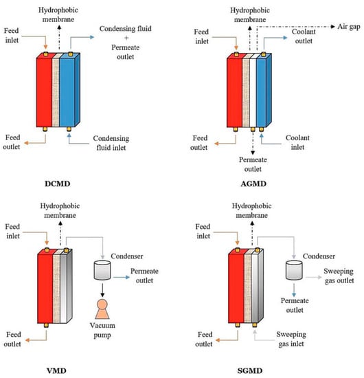MD processes can be majorly classified into four major configurations depending on the methods to induce a vapor pressure difference across the membrane and the type of the permeate collection on the cold side [,,]. It is mandatory that the feed solution is in contact with the hydrophobic surface of the membrane in all configurations. Figure 2 illustrates the conventional configurations of the membrane distillation system and Table 1 presents their advantages, limitations, and applications.