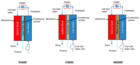 In further advancements, the air gap in AGMD is filled by different materials, which can be classified as thermally conducting or non-conducting materials (Figure 3). This includes metal mesh polypropylene mesh, polyurethane sponge, sand, etc. []. These attempts are made to increase the permeate flux and/or decrease the conductive heat loss across the membrane. The configuration that uses the conducting plate in the gap is also called conducting gap membrane distillation (CGMD), and higher heat loss is expected similar to DCMD, but it could also help to reject the non-volatile compounds at low temperature.
