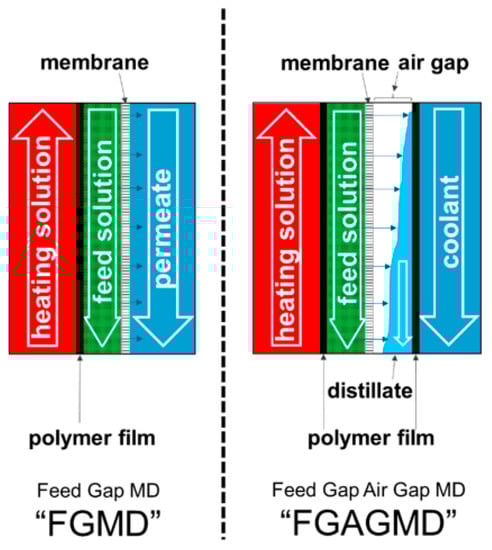 The FGMD mode is the horizontally flipped arrangement of AGMD mode where the feed solution is circulated in the air gap which is heated by the heating solution introduced in the former coolant channel of AGMD (Figure 4). The permeate channel is the former feed channel in AGMD. The heating solution and the feed channel is separated by a heating plate or film. This configuration is to increase the permeate output, which is limited by sensible heat contained in permeate stream. Advancement to this is the feed gap and air gap membrane distillation (FGAGMD) configuration. Where an air gap is maintained between feed and permeate, and the latter will be externally cooled by the coolant as in AGMD. Accordingly, in FGAGMD, both the feed and permeate are separated from their heating and cooling solution. This FGAGMD configuration is useful for the treatment of industrial wastewater containing corrosive and toxic substances [].