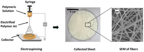 Schematic diagram of electrospinning technique. Modified from []: Designing Solutions for Electrospinning of Poly(ionic liquid)s. Macromolecules, 52, 5223–5230. Copyright (2019) with permission from American Chemical Society. Further permissions related to the material excerpted should be directed to the ACS.