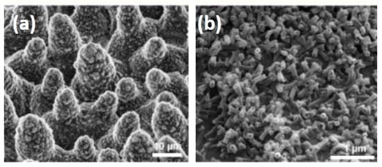 (a) Lower and (b) higher magnification SEM image of lotus leaf showing the hierarchical surface structure consisting of papillae, wax clusters, and wax tubules [].