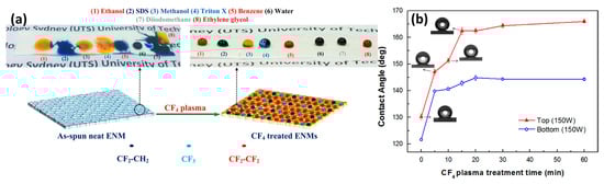 (a) Schematic illustrations of the neat and CF4 plasma-modified electrospun nanofiber membranes. Reprinted from []. Copyright (2017) with permission from Elsevier. (b) Water contact angles of top/bottom PVDF membrane surface as a function of CF4 plasma treatment time. Reprinted from []. Copyright (2014) with permission from Elsevier.