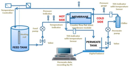 A typical DCMD setup widely investigated for desalination of saline water is shown in Figure 12. The setup contains a holder to fix the membrane (flat sheet or fiber) inside. A heater and chiller are included for heating the feed water to be treated and condensing the permeate water vapor, respectively. The feedwater is usually heated to around 40 °C to 80 °C and circulated through the hydrophobic side of the membrane. The cold water at 20 °C to 40 °C is circulated on the other side of the membrane to condense the water vapor permeated from the membrane pores. Flow rate, temperature, and pressure of both feed and permeate water are the important parameters that affect the desalination and need to be monitored during the process. This DCMD design can be replaced with other modules such as VMD, AGMD, or SGMD, provided with their basic requirements (vacuum, airgap, sweep gas) and integrated with other desalination, crystallization, and power generation technologies, which are discussed in the following sections.