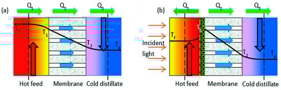 Schematic of (a) conventional DCMD and (b) novel photothermal DCMD with a nanomaterial coating and localized heating at the membrane surface. Reproduced from [] with permission from The Royal Society of Chemistry.