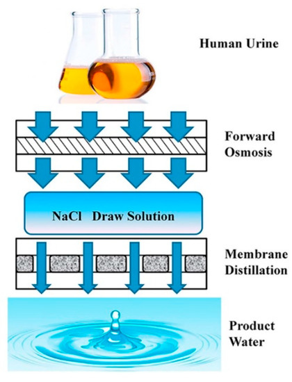 Schematic diagram for the integrated forward osmosis-membrane distillation process for human urine treatment. Reprinted from [] Copyright (2016) with permission from Elsevier.