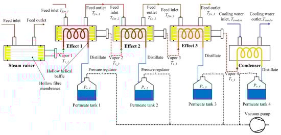 Schematic diagram of a three-effect HF V-MEMD system (the solid lines illustrate the liquid, while the dashed lines denote the vapor). Reprinted from [] Copyright (2020) with permission from Elsevier.