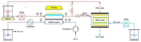 Reverse electrodialysis (RED) is a process whereby energy is generated by transport of (salt) ions across the ion exchange membrane due to salinity gradient []. As MD results in the production of highly concentrated saline feed, this process can be used to produce a high salinity gradient for power generation using RED. Recently, Avci et al. [] demonstrated a solar MD–RED hybrid process for the light–heat–energy conversion (Figure 18). They used a photothermal (Ag nanoparticle-incorporated PVDF) membrane which was able to generate heat by ultraviolet irradiation. The heat produced was then used for heating the feed in SGMD. The cold distillate was collected separately while the concentrated brine from the feed side was sent to high-concentration component (HCC) of the RED module. The low salinity component (LCC) was fed with the low saline water. The concentration gradient between HCC and LCC solutions drives the positively and negatively charged (salt) ions in opposite directions across the ion exchange membranes generating the ionic current. This hybrid set up is a demonstration for the process intensification in desalination with a recovery ratio (87.5%) higher than individual RO process and which can simultaneously produce freshwater through MD and power generation (maximum power density for membrane pair, MP, reported 0.9 W/m2) through RED. In another work, Tufa et al. [] demonstrated an integrated SWRO–MD–RED system and was able to produce RED power density of 2.2 W/m2 MP. Compared to individual SWRO, the integrated system exhibited 23% reduction in the energy consumption in the desalination.