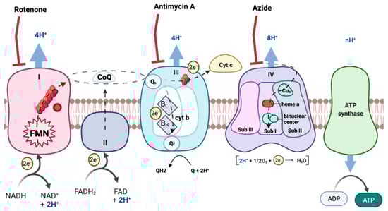 ROS formation can occur in many tissues and through many routes. However, the mitochondrial respiratory chain (MRC) is one of the main producers of ROS [] (Figure 1). MRC is located in the mitochondria, an organelle of most eukaryotic cells that carry out numerous biochemical reactions to maintain cellular physiology and homeostasis [,]. In this way, impaired function of mitochondria leads to damaged bioenergetics, calcium homeostasis dysregulation, decreased ATP production, increased production of free radicals, augmentation of oxidative stress and initiation of apoptotic processes [,].