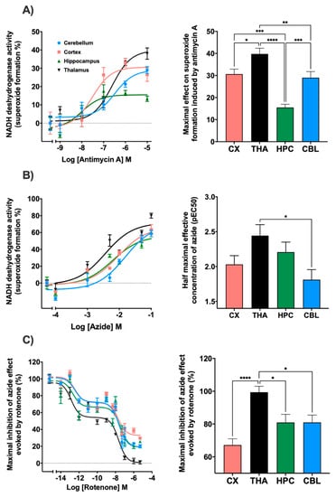 In relation to the complex III inhibitor, antimycin A, regional differences were observed in terms of the maximum effect produced. In the thalamus, a maximum effect of 39.7% was reached, while in the cortex and cerebellum the values remained at 29.0% and 30.6%. In the hippocampus, the maximum effect reached was 15.5% (Figure 3A). Regarding the potency, the cortex presented significant differences with thalamus and cerebellum (Figure S2). Sodium azide inhibited mitochondrial complex IV with a similar result in all brain areas such as the cerebellum, cortex, and thalamus reaching values of 78%, 68.2%, and 73.3%, respectively. The hippocampus was the region where the lowest inhibitor effect was obtained with an impact of 58.6%. Significant differences were observed in the potency of this drug between the thalamus and cerebellum (Figure 3B). In addition, the inhibition of the mitochondrial complex I, NADH-ubiquinone oxidoreductase, by the action of rotenone was determined (Figure 3C). The maximal effect of superoxide formation was established by adding sodium azide without any inhibitor. When using azide in the presence of rotenone, a decrease in the maximal superoxide formation was observed with significant differences between the thalamus and the rest of the brain areas. Inhibition values of 81.0% in the cerebellum and hippocampus, 67.2% in the cortex, and 99.4% in the thalamus were achieved. Furthermore, rotenone also slowed down NADH consumption. A two-phases curve is obtained in all the brain areas. A first decay phase was observed at a rotenone concentration of 0.01 pM and a second one at 5 nM. The curves were adjusted to competition for two binding sites.