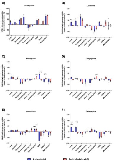 Next, superoxide-forming capacity of the six most commonly used antimalarials was evaluated: Atovaquone, quinidine, mefloquine, doxycycline, artemisinin and tafenoquine. In general, drug-induced superoxide formation in absence and presence of dUQ showed a differential profile specific to the studied tissues. Thereby, cell membranes isolated from the liver, jejunum and adrenal gland showed a higher superoxide production.