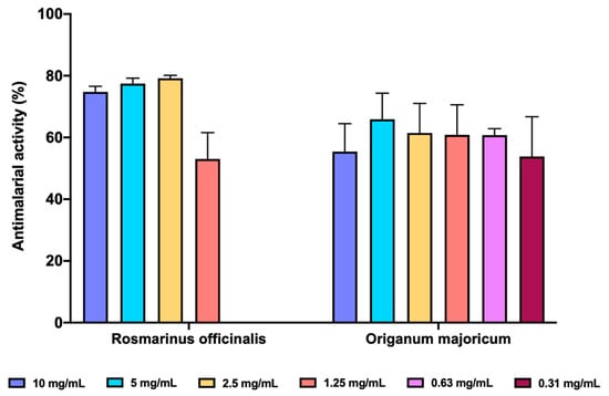 In vitro antimalarial activity of R. officinalis and O. majoricum EOs. Data are expressed as percentage of inhibition ± standard deviation (SD). All assays were carried out in quadruplicate.
