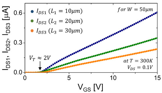 Measured transfer characteristics for VDS = 0.1 V of the fabricated IGZO TFT with three different L (see Table 1).