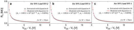 Regarding the effects of contact resistance, RC was extracted, as seen in Figure 3, by applying Equations (8)–(10) to the transfer characteristics of three pairs of TFTs (see Figure 2). As can be seen in Figure 3, it is obvious that the extracted results have been well-matched with the proposed model using a power-law. Here, it was found that it decays with increasing VGS. This is because the contact resistance is reduced by narrowing of the Schottky barrier due to a higher gate bias [2,17]. In keeping with this, the results modeled using Equation (11) showed good agreement in all three cases. The retrieved values of the RC model parameters are listed in the first row of Table 2. As can be seen in Figure 3 and Table 2, the values of the AC and αc for all three cases are approximately very similar to each other, with discrepancy negligible at less than 1%. This suggests that the RC extraction method proposed here is accurate and consistent. Note that the extracted RC trend for different pairs of TFTs should be the same in principle, and very similar practically as long as the same initial fabrication process was applied and the same ambient conditions were maintained.