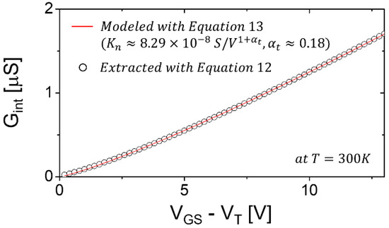 Using the retrieved model parameters for RC, the intrinsic channel conductance (Gint) was then accurately extracted using Equation (12). In other words, we were able to remove the effect of RC for accurate extraction of Gint. As seen in Figure 4, it is clear that good agreement between the extracted and modeled results was achieved. Here, it was found that Gint increased without any root-function behavior. However, it exhibited slightly parabolic behavior, with an exponent > 1 using the power law. From this result, it was found that the trend of Gint could be modelled with a power law with the exponent 1.18 (i.e., Equation (13) with 1 + αt for αt = 0.18). While the crystalline material-based transistor has the exponent of unity, in our case, the retrieved value of the exponent, i.e., 1.18, was found to be slightly greater than unity. This implies that the channel material is non-crystalline, and thus a disorder. As seen in Table 2, kTt is 4.7 meV < kT at 300 K, which is consistent with the literature [16,18]. This suggests that the degree of disorder is less than amorphous Silicon, with kTt > kT. As for a physical interpretation, the conduction band of the AOS, e.g., IGZO, is composed of spherical orbitals (i.e., s orbitals) of metal cations; thus, the AOS is insensitive to the bonding angle disorder, whereas amorphous Silicon has strong bonding directivity due to the sp3 orbitals of its conduction band [18,19,20]. However, the AOS still has a bonding distance error in the amorphous phase, alluding to the existence of localized traps associated with band tail states, which can be estimated using extraction methods based on the current-voltage and capacitance-voltage characteristics [18,21]. In order to minimize these localized traps, process conditions can be optimized in terms of the AOS target compositions for the sputtering process, oxygen partial pressure, and annealing temperature [1,3,22].