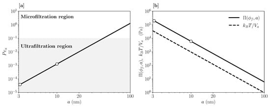 where is the particle volume, and is the particle volume fraction. This expression holds to high accuracy up to the freezing transition volume fraction . In Figure 2b, the maximal fluid-state osmotic pressure reached at freezing, , is plotted as a function of the particle radius a in conjunction with the thermal pressure , where is the Boltzmann constant, and T is the dispersion temperature. Notice that the dependence of both quantities implies that the osmotic pressure is strongly reduced with increasing particle size.
