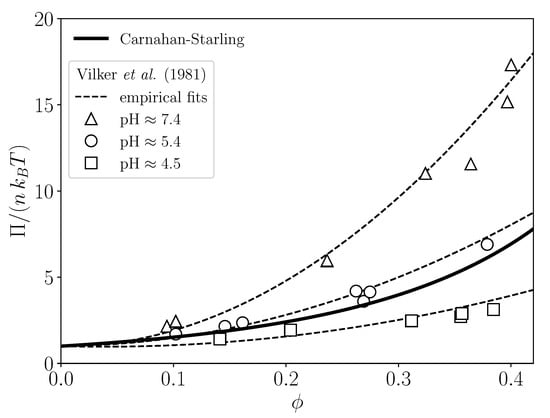 To illustrate that the Carnahan–Starling expression for neutral hard spheres is a decent description also for aqueous solutions of globular proteins near the isoelectric point; in Figure 3, we depict osmotic pressure data by Vilker et al. [30] as a function of , for bovine serum albumin solutions at three different pH values. As noted in [30], the isoelectric pH value is about in a M saline solution. We determined the volume fractions in Figure 3 from the protein concentration values and the equivalent spherical radius value nm given in [30]. The pressure data at are located below the Carnahan–Starling curve, suggesting that there is an attractive interaction contribution.